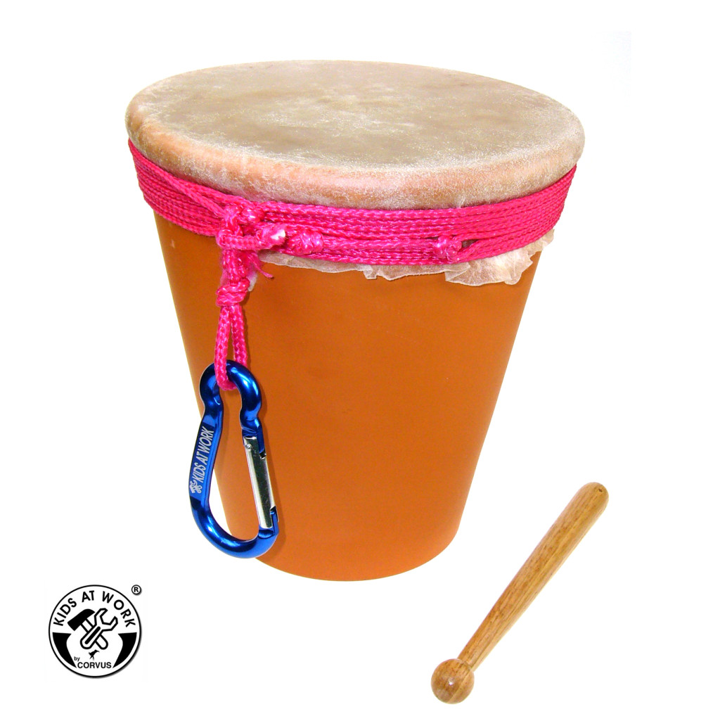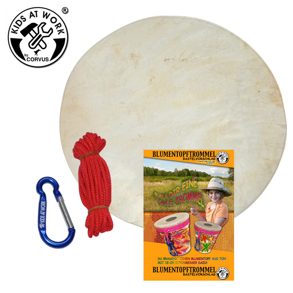 Ez a készlet egy kis dob felépítésre alkalmas, pl. virágcserép alapra (nem tartozék). A nedves dobbőrt az edényre feszítjük ami a száradása közben ráfeszül az edényre. Remek hangja lesz! A karabinerrel az övre lehet rögzíteni, és máris kész a menetdob.