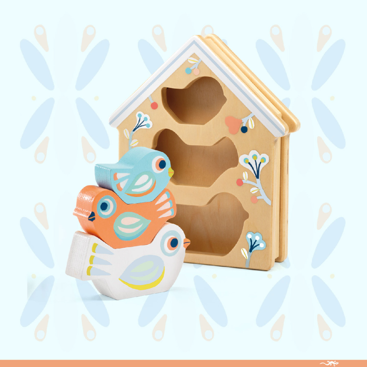 A Djeco lágy formákat, halvány színeket használ a játék kivitelezéséhez, ezzel kedvessé és nagyon szerethetővé varázsolja a termékeit. A Fióka kezdő építőjáték, amiben három kismadár repül, ül egymásra. Papa madár jobbra néz, mama madár balra néz, legfelső a fióka. A formák fokozatosan kisebbednek, érzékelhetővé teszik a nagyságrendi különbségeket, elhelyezésüknél az irányokat figyelhetik meg a gyermekek. A formabedobó doboz, a házikó, a próbálgatás alapján szerzett tapasztalatokból készít tudást. Kedves játék, gyengéden tanít. Üdítően szórakozat.