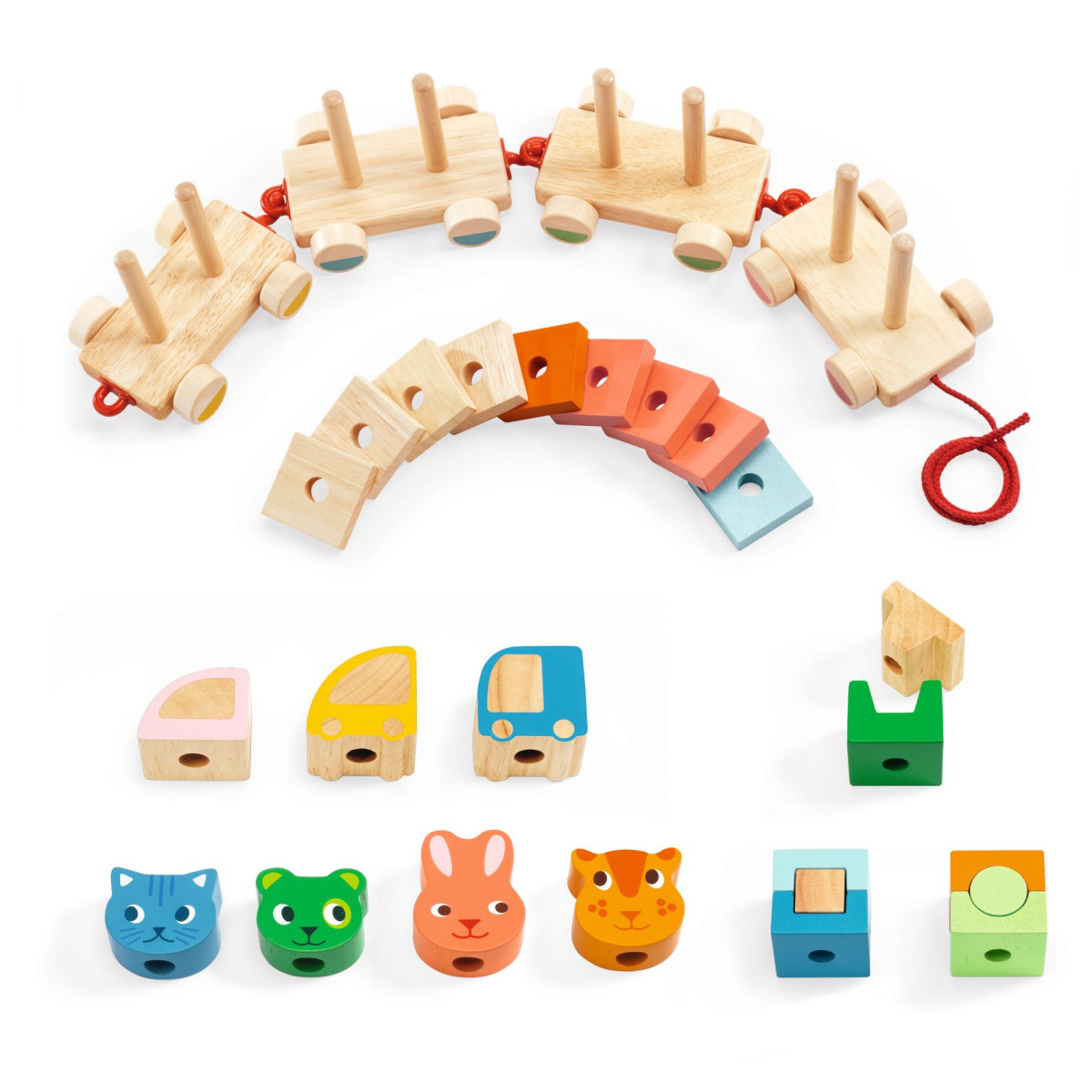 Több darabból álló minőségi fából készült húzható építőjáték.