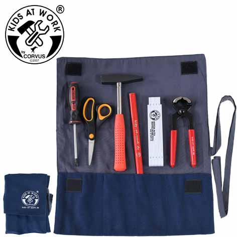 Gyerekkézbe illeszkedő kéziszerszámok strapabíró szövetből készült, feltekerhető tárolóban.