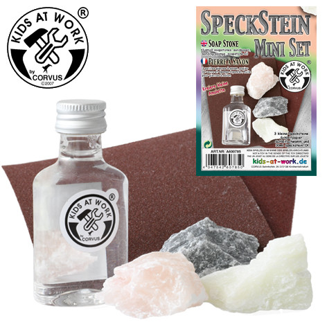 Szappankő mini készlet, amely 3 kicsi, különböző szappankövet tartalmaz, valamint csiszolópapírt, és csiszolószivacsot a nedves csiszoláshoz, és 30 ml szappankőolajat. Alkoss kis ékszerköveket, medálokat és még sok mást.