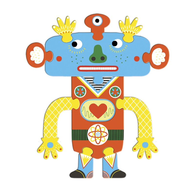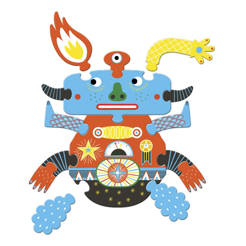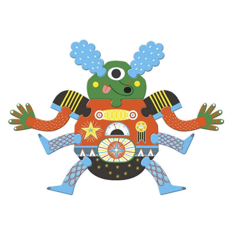 A 39 darabból álló puzzle kreatív képkirakást tesz lehetővé. Nagyokat lehet nevetni azon, hogy mit hová helyez az ezzel szórakozó gyermek, vagy felnőtt. Újabbnál-újabb szörnyikéket lehet megalkotni a Djeco puzzle sorozatában megjelent "Crazy puzzle"-ből.