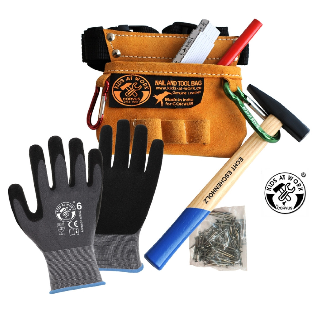 Ha azt szeretnéd, hogy a szerszámok mindig kéznél legyenek. A készletben benne van 1 db 1 m-es colstok, 1 db kisméretű, 5 cm-es karabiner, 1 db nagyméretű, 8 cm-es karabiner, 100 db 2 x 30 mm-es szög, 1 db kisméretű kalapács, 1 pár munkavédelmi kesztyű, 1 db ácsceruza.
