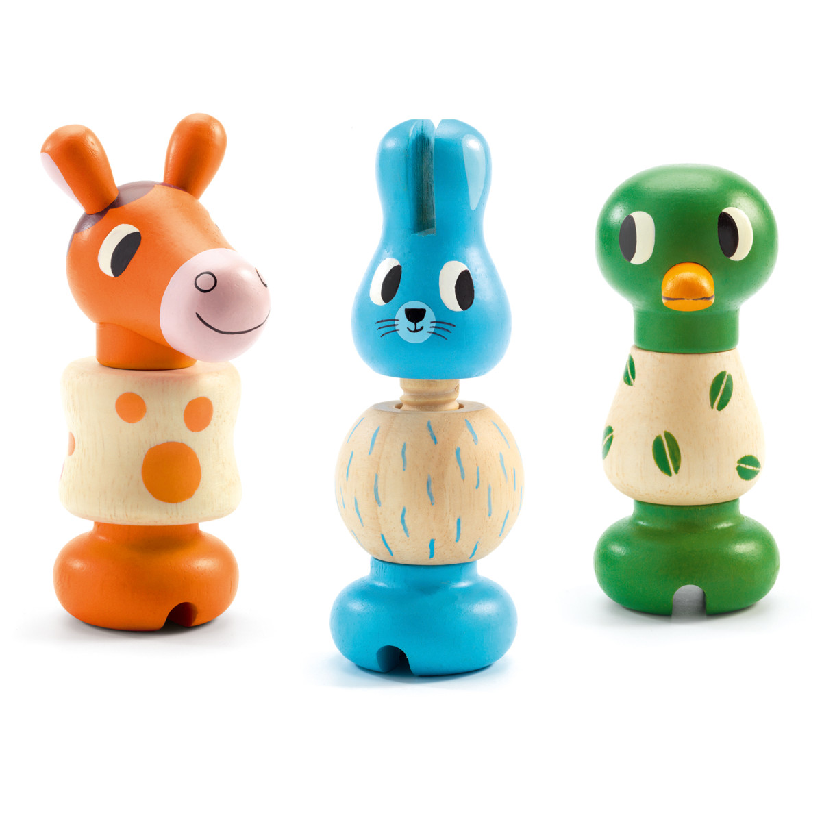 Tartalma: 3 db állatfigura, csacsi, nyuszi, kacsa, amelyek 3 részből építhetők fel.
