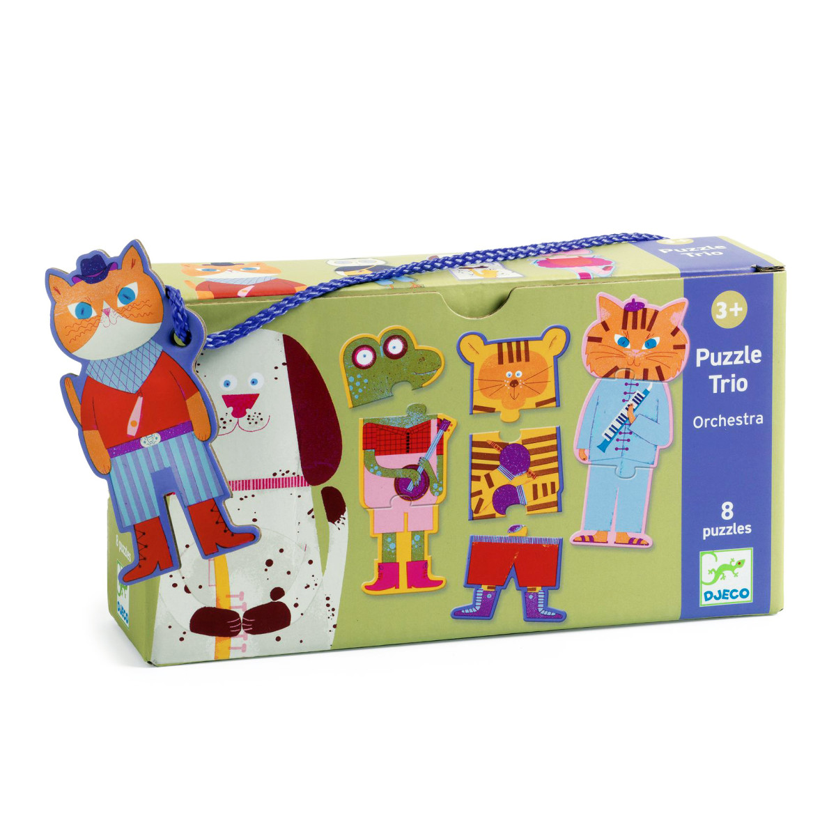 Láttál már tigrist furulyázni? Hóbaglyot szájharmónikával és nyuszit triangulummal? Ha még nem, akkor jól figyelj, mert a Djeco TRIO-PUZZLE sorozatának egyik új tagja, az ORCHESTRA révén, az állatokat új oldalukról ismerhetjük meg...A 3 éves kortól ajánlott kirakósban az állatokat 3 részből kell összeállítani függőleges irányban. Ha elkészültek az apró kezek, 8 állatka mosolyog ránk kezében/zsebében a hangszerével.