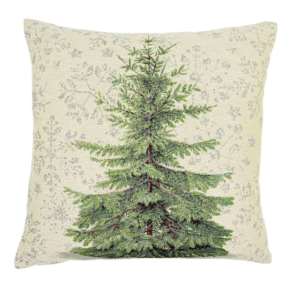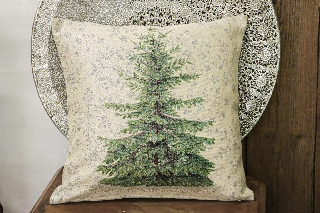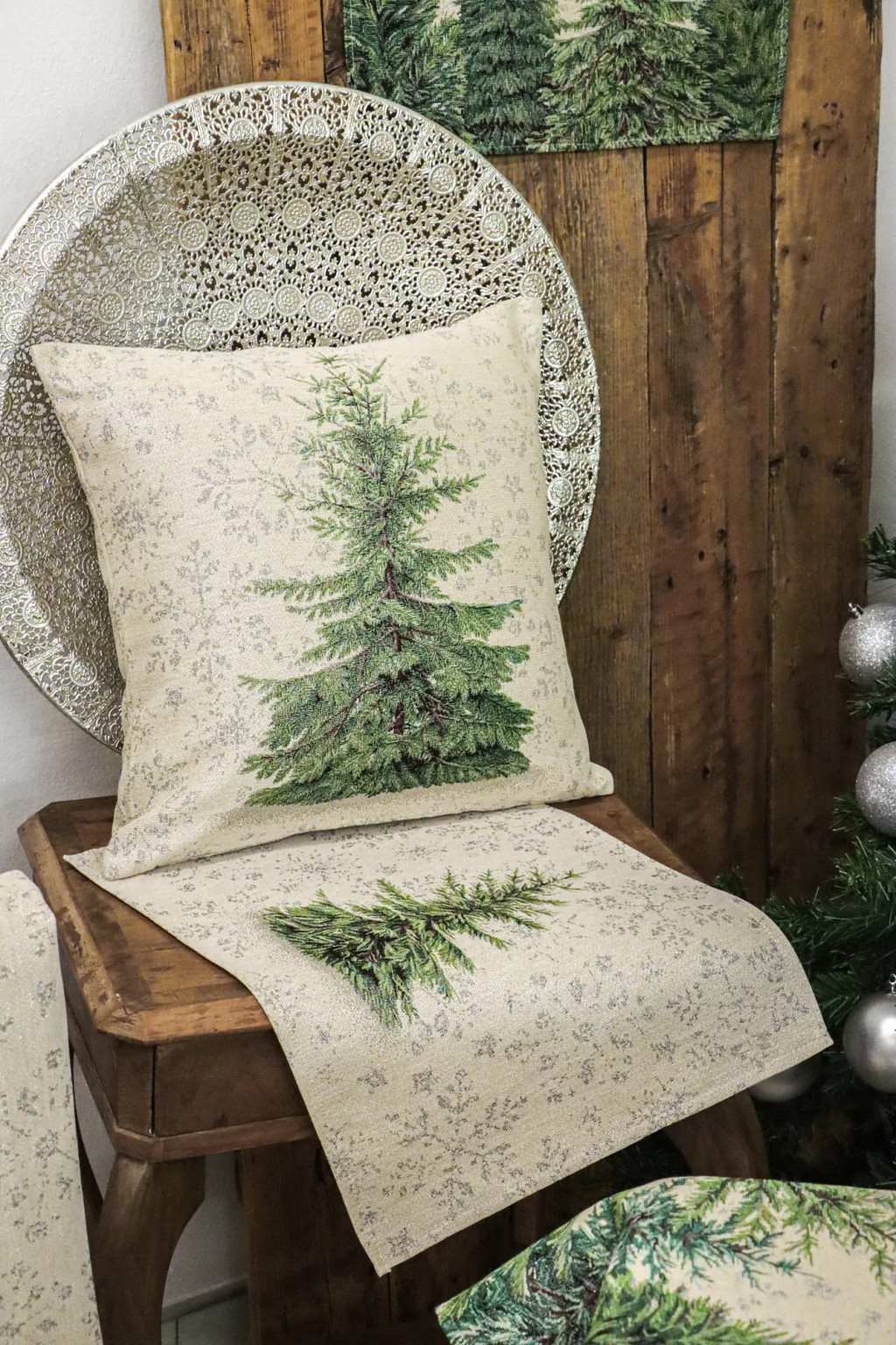 A Silver Forest fenyőfás gobelin díszpárna huzat – 45×45 cm (ezüst lurex) modern, mégis meghitt téli hangulatot visz az otthonodba. A mintán stilizált fenyőfák sorakoznak egymás mellett, mintha egy csendes, havas erdőt látnánk egy téli reggelen.